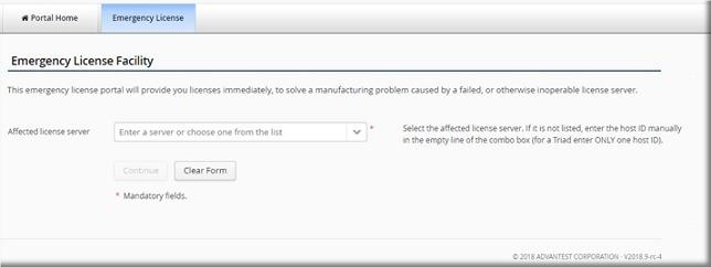 Before you can request emergency licenses, you must be logged in at the Advantest License Portal and you must have information about the affected license servers that need emergency licenses and the replacement license server (host ID and hostname).