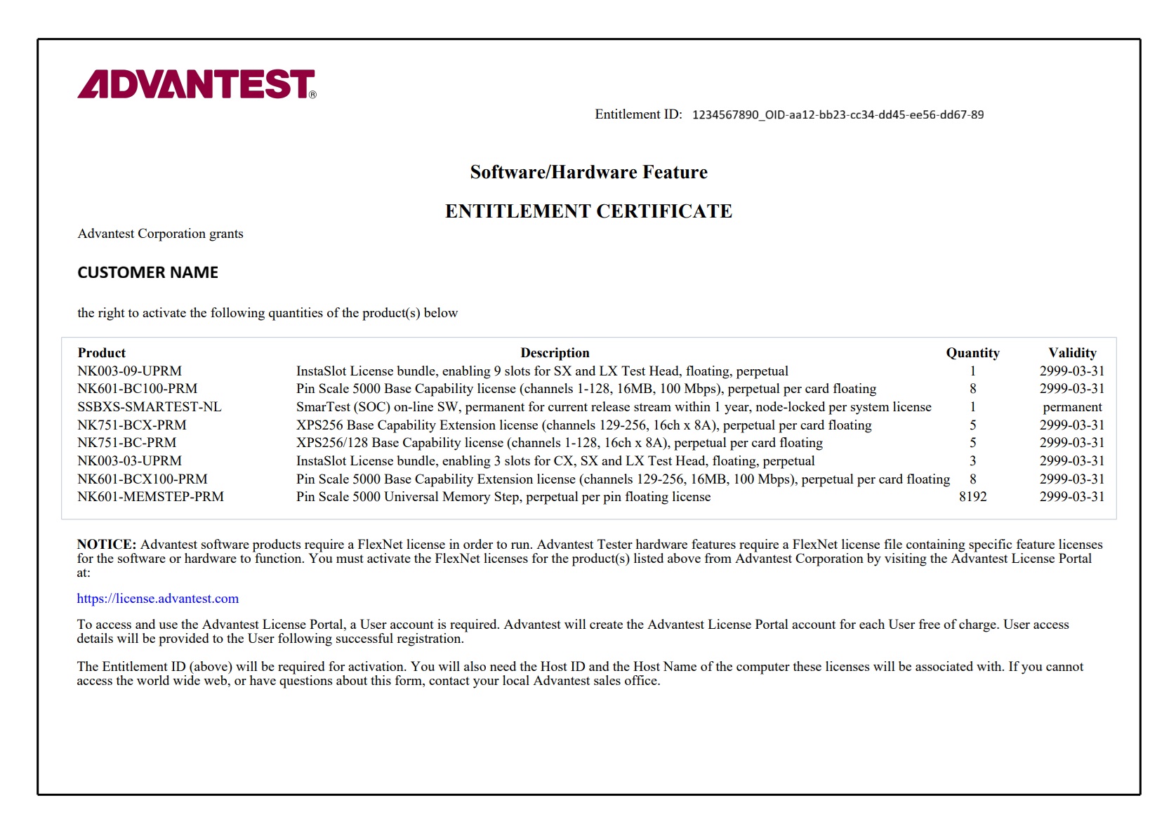 - There is a line for each license product visible in the box. Each line contains the Advantest license product name like "NK003-09-UPRM", the product description like "InstaSlot License bundle, enabling 9 slots for SX and LX Test Head, floating, perpetual", the number of license product available like 1 in the column Quantity and the validity, which means when the license will expire. The date 2999-03-31 stands for 31st March 2999 and is called "permanent" as this date is far in the future.