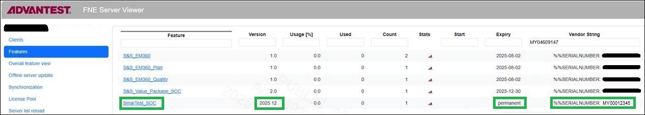 Here the SmarTest license with feature SmarTest_SOC (column Feature) has the date version 2025.12 (column Version), which is the date December 2025. In column Expiry you see that the license is permanent and in column “Vendor String” you see for the serial number the value MY00012345, which means that this SmarTest license is bound to the tester with serial number MY00012345.