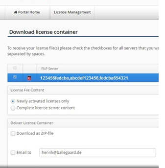 You need to use the download/email function in the License Portal to get the license container. The license container is delivered in a zip file which you must unzip to get the actual license container "bin" file.