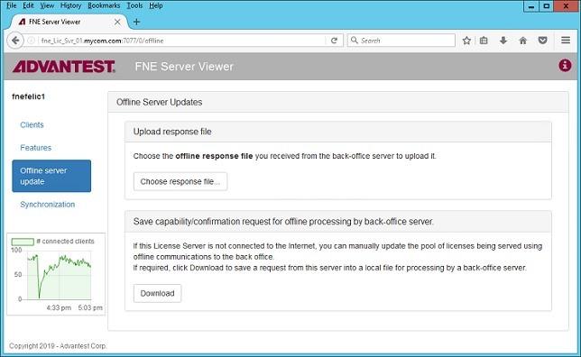If the FNE license server is not connected to the internet you must manually download the license container from the Advantest License Portal and upload it to the FNE license server.